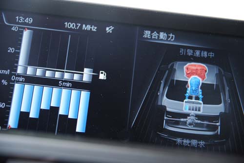 | 駕駛可透過螢幕畫面監控整個Hybrid動力系統的作動狀況以及油耗值表現。 |