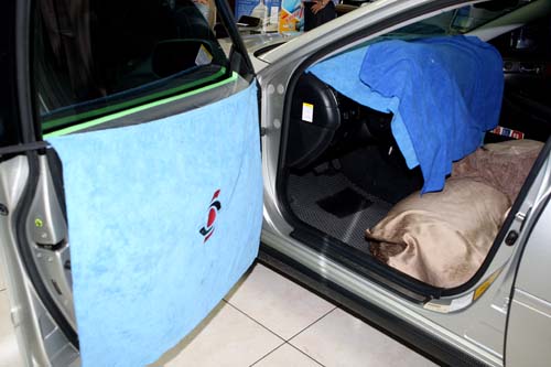 | 門內飾板除了用防水布貼齊,也將整車內裝完整遮蓋,對每個施工步驟都要求完美。 |