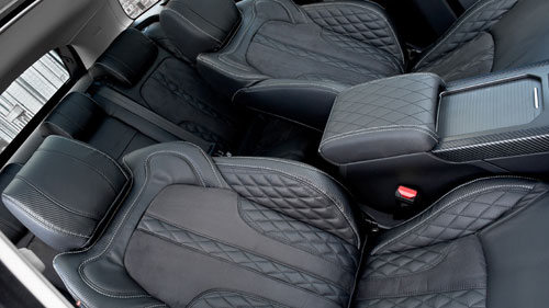 座艙部份,Kahn將內裝所有皮革材質加以重新鋪陳,並輔以碳纖維飾板點綴,其中座椅換上皮革與麂皮廂間設計,搭配菱格紋樣式,營造出極具豪華感受,同時也賦予更為舒適的乘坐品質。