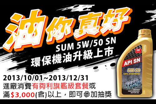 『SUM汽車保修聯盟』即日起至2013年12月31日止,為慶祝環保機油升級上市,特別推出《油你真好》活動;活動期間進廠,不限廠牌均享有免費26項冬季安全健診,另外,還有兩項超值活動套餐、常用零件9折優惠及滿額抽獎活動呦~此外,針對網友們在10月7日至10月19日舉辦限時網友活動,符合資格即贈送SUM名片型行動電源乙個。可參考活動網頁;若對於整體活動方案有進一步瞭解的需求,請至SUM汽車保修聯盟服務據點或SUM汽車保修聯盟官網。