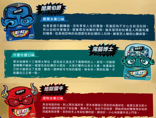 Skittles®彩虹糖萬聖節期間限定的「闇黑水果口味」內含5種來自黑暗世界的恐怖水果口味,分別為「午夜萊姆」、「悲傷石榴」、「伊甸禁果」、「闇黑野莓」以及「血色柳橙」,刺激你的膽量與味覺。新口味搞怪還不夠,Skittles®彩虹糖再推出3款搗蛋面具組,買就送萬聖節變裝派對必備的搞怪搗蛋面具,今年萬聖節吃了Skittles®彩虹糖依舊要搗蛋!搗蛋面具的3款角色分別為「闇黑伯爵」、「地獄蠻牛」、還有「魔腦博士」,包裝上還附有角色的搞怪小故事,為搗蛋面具添加了不少詭異氣氛。Skittles®彩虹糖「闇黑水果口味」與3款搗蛋面具組即日起在全省各大通路搗蛋上市!萬聖節大家一起吃一口彩虹再搗蛋!