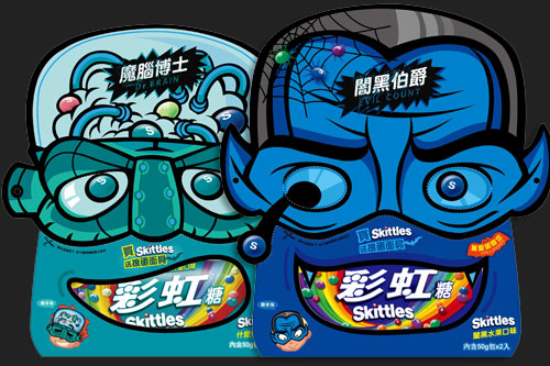 為迎接萬聖節,搞怪始祖Skittles®彩虹糖推出限量搗蛋面具組,3個各懷鬼胎的Skittles®彩虹糖角色分別為「闇黑伯爵」、「地獄蠻牛」及「魔腦博士」,搭配3種不同口味,其中「闇黑伯爵」更搭配了萬聖節限定的「闇黑水果口味」,來自黑暗世界的詭異口味,好吃有趣讓人驚喜連連,今年萬聖節一起吃一口彩虹,戴上面具搗蛋去!