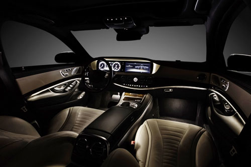 延續霸氣而不失動感的外觀造型主軸,座艙內的 S-Class 同樣精采。大量採用金屬、木質、頂級皮革與氣氛燈打造出的極致空間,兼具了科技、奢華、放鬆等多重面向的乘坐氛圍,還可利用光纖科技於七種顏色與五種照明亮度中自由切換,如頂級Lounge般的舒壓環境,更是提升乘坐舒適度的創新思維。