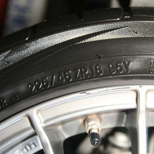 輪胎的規格都會標示在胎壁之上,最明顯的就是尺寸規格的部分,通常會由三組數字與一組英文字母組成,以圖規格作為範例:225/40 ZR18,第一個數字「225」代表的是胎面接地寬度,單位是公厘(mm)。後面的「40」稱為扁平比,胎面寬度乘以扁平比的%數,就是實際胎壁高度,以此輪胎為例:225mmx40%=90mm。接著看到的英文字母成見的有3種,分別是「R」、「ZR」、「X」,其中常見的R與ZR代表的胎內簾布層結構是「子午線」形式,具有接地面積大、滾動阻力小、壽命長等優點,目前多數輪胎都屬於這種形式,子午線輪胎中安全限速高於240km/h的則標示成ZR。剩下較少見的X表示為「高壓胎」。最後的「18」代表輪胎的內徑,也就是鋁圈的尺寸,單位為英吋。