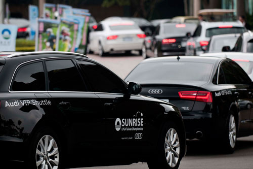 為了迎接來自世界各地的高球嬌客,擔任LPGA台灣錦標賽大會唯一指定用車的台灣奧迪汽車,特別提供總價上億的Audi禮賓專車接待國際好手們,其Audi禮賓專車陣容包含四環品牌豪華頂級旗艦房車─Audi A8、頂級7人座豪華休旅旗艦─Audi Q7、動感美型Coupe’跑房車─Audi A7與進化的總和之科技旗艦─Audi A6等總計25輛頂級車款,以超高規格接待此次與會的國際球星和精英貴賓,一舉展現德國汽車領導品牌的磅礡氣勢!