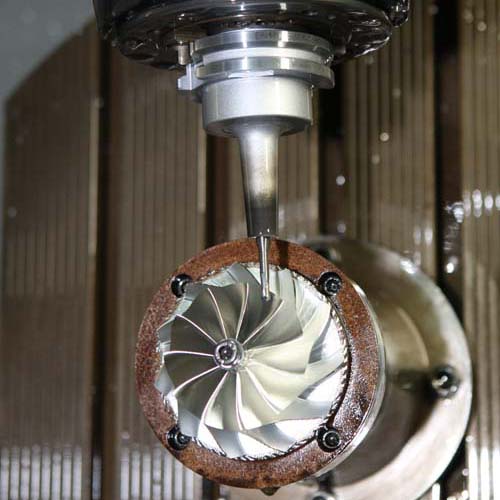 而所謂的鍛造CNC葉片,顧名思義就是採用比一般鑄造鋁合金強度更高的鍛造鋁材,然後再以CNC的方式將鋁材切削成渦輪進氣側葉片,然而這種製造方式不僅成本相當高,在技術層面上來說更是有一定的難度,因為渦輪葉片的角度相當複雜,一般三軸、四軸的CNC機器是無法切削出來,必須用上更昂貴的五軸CNC才能夠製造出形狀複雜的葉片。