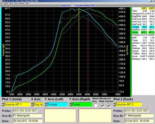 換上了Sumalaya的鍛造CNC進氣葉片後,本車再度架上馬力機進行調校,由於渦輪進氣量變大而原本的供油勢必會稍微不足,經過了Kaki重新的調整之後,本車同樣以1.5bar的增壓值拉出495.2hp與58.6kgm的輸出,相較於原本GT3076R渦輪的表現,動力增加了約38hp與4.5kgm,成長幅度達8.3%的水準,且由馬力圖可發現,不論馬力或是扭力的峰值轉速都提前約250rpm左右,光是更換小小的葉片就能帶來這麼大的差異,足以證明更換鍛造CNC進氣葉片的價值所在了。