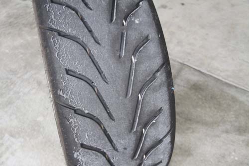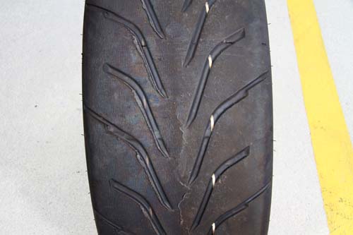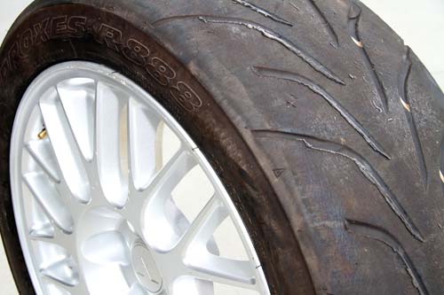 | 經過6圈測試下來後,Toyo Proxes R888的熱融現象並不明顯,只在胎紋邊緣可得到胎面融化現象。 |