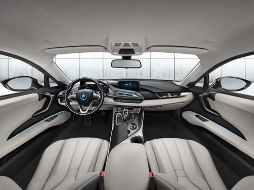 i8內部的可插電式Hybrid動力系統代表的是BMW長期以來專注於車輛節能科技的具體表現,量產版本為了追求目前汽車使用環境的現實考量,Vision EfficientDynamics原始的三缸柴油渦輪增壓引擎搭配前後兩具全時四輪驅動模式的電動馬達,已改為1.5升三缸雙渦輪增壓汽油引擎結合前軸電動馬達,綜效馬力可達362hp,而5kWh的鋰離子電池及插電式油電系統,更可提供純電動模式35公里,油電混和動力模式可達500公里以及平均油耗超過40km/h的超高境界。