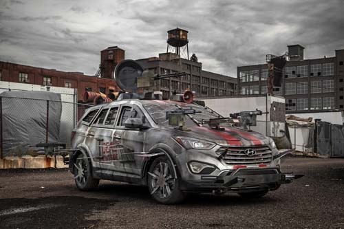 美國熱門殭屍影集《陰屍路》已拍攝到堂堂第四季了,長期贊助美國有線電視頻道AMC製作這套駭人節目的Hyundai特別在新一季開跑前,於官網上介紹片中新武器Santa Fe Zombie Survival Machine,預計這部怪車可讓Rick Grimes一行人屠戮殭屍到不亦樂乎的地步。其實這部Santa Fe是Hyundai評選出來的其中一部,其他提供的車款還包括Veloster Turbo和Elantra,最終Hyundai與劇組看中的是車主Anson Kuo交給Galpin Auto Sports公司打造的這部裝甲怪獸。Anson的Santa Fe主要的武器包括車側和車頭的大量刀片及兩挺步槍、引擎蓋上架著一具重弩和兩挺步槍,頂篷則架著一挺重機槍伺候著,其目的自然是為了保護乘客及運送的物資,當然這對於毫髮無損的消滅活屍有著莫大的功效。