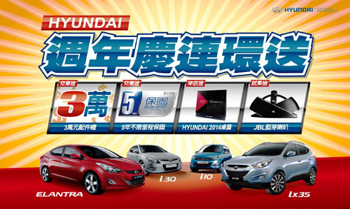 好康不只ix35有,HYUNDAI乘用車全車系(不含商用車款)在本月也不遑多讓;本月(11月)交車即送3萬元配件禮,以及5年不限里程延長保固。