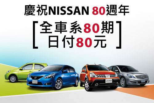 NISSAN汽車2013年正式邁入80週年,以持續創造經典車型,滿足車主愉悅駕馭為宗旨,裕隆日產汽車為歡慶NISSAN 80週年並回饋消費者多年來支持,自即日起訂車且於11月29日前領牌,特別推出「全車系80期分期付款 日付80元」優惠專案,NISSAN國產車系同時享有6大系統8年不限里程延長保固,日本原裝進口豪華休旅NISSAN ROGUE更提供9.9萬元起低頭款和80萬元高額零利率之史上最大優惠,讓車主輕鬆享受優質產品與體驗駕馭樂趣。