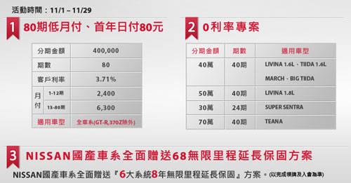 註1:此低利分期專案係由經銷公司提供,現金優惠購車總價與分期購車總價係有價差,詳細交易條件請洽各經銷公司,經銷公司並保留最後核准與否權利。GT-R與370Z等車系不適用此低利分期專案。