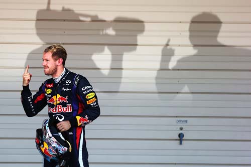 自從2010年成為F1史上最年輕冠軍以來,由於繼續衛冕蟬聯至今,因此Vettel逐年更新最年輕二冠、三冠、以及今年會達成的四冠紀錄(當然也是最年輕連冠紀錄),今年的新加坡站到韓國站,他亦成了F1史上第三位連續兩站大滿貫(起跑竿位+決賽優勝+全場最快單圈)的車手(前兩位是1952年德國站到荷蘭站的Alberto Ascari以及1963年荷蘭站到法國站的Jim Clark),目前他尚在個人F1生涯的前期,就已經寫下這麼多歷史紀錄,未來能再刷新的紀錄還多得很。還有一個現象,就是從放完暑休以來,Vettel囊括了至今的每一站比賽,上期在他二連勝時,我說他進入了像去年差不多同時一樣的連勝期,而本期已經五連勝了(去年的連勝期還「只有」四連勝),所以剩下的問題就是他可以推進到幾連勝,Hamilton認為Vettel很有可能達成平歷史紀錄的九連勝,那是Ascari從1952年末到1953年初的「跨賽季」連勝,而目前的單賽季紀錄是Schumacher於2004年的七連勝,只要Vettel在印度站和阿布達比站不「失準」,他就平了同胞前輩的紀錄,接下來的美國站和巴西站,就是他為自己的四連冠再錦上添花的機會了。
