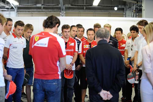 | F1車手協會在日本站決賽前為身故的前Marussia試車手M.deVilotta默哀1分鐘(可不是「一鞠躬10秒鐘」)。 |