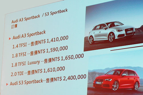 台灣奧迪汽車正式宣佈全新Audi A3 Sportback豪華小型掀背房車在台上市,車系旗下四款車型的建議售價,分別為141萬元(1.4 TFSI)、159萬元(1.8 TFSI)、165萬元(1.8 TFSI Luxury)以及161萬元(2.0 TDI),至於全新S3 Sportback高性能運動掀背鋼炮則為240萬元。憑藉著獨特出眾的造車理念,全新Audi A3 Sportback不僅將為您開創出前所未見的駕駛視野,也將時時刻刻豐富您與家人所共同擁有的每一段愉悅旅程;至於全新S3 Sportback更是不容追求極致駕馭快感的熱血車迷們錯過!