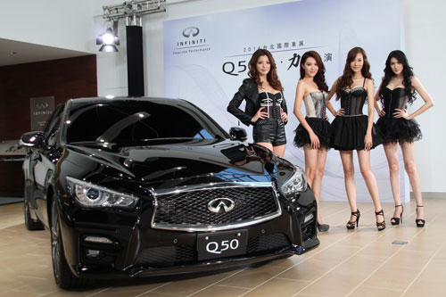 全新豪華運動跑房車INFINITI Q50於14日媒體活動中首度曝光,並將於2014年台北國際車展與全台消費者見面。INFINITI Q50首度於2013年北美底特律車展中發表,令人驚艷的疾勁式跑車化車身與流體雕塑運動折線,並由F1一級方程式冠軍車手Vettel親自調校,將INFINITI獨特的設計與動力美學再次昇華。特別是預告首度導入2.0T賓士引擎及3.5 Hybrid全油電混合兩種車型,入門售價有望低於200萬元,上看年銷售目標破千輛。
