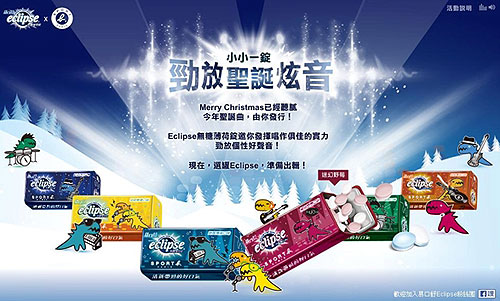 Eclipse易口舒聖誕炫音限定版季節罐已陸續在各大便利店及量販通路等限量上市,另外在全省全家便利商店更推出薄荷系列與水果系列的精裝限定版鐵盒,引起廣大粉絲蒐集珍藏。12月起至錢櫃KTV消費唱歌,手機掃描點歌機上的QR code,完成個人Eclipse易口舒聖誕歌曲,即可免費獲得Eclipse易口舒無糖薄荷錠一罐,獲得沁涼舒爽好口氣將帶來耀眼迷人的自信魅力。數量有限,送完為止。