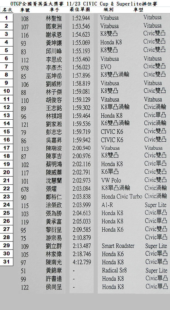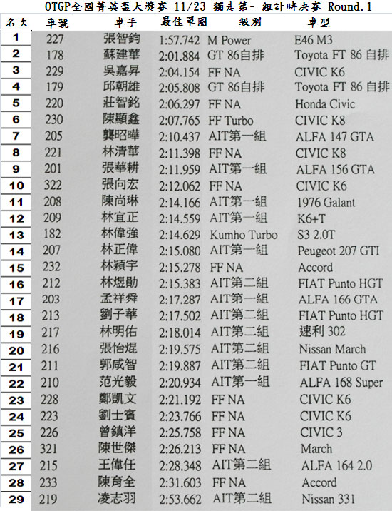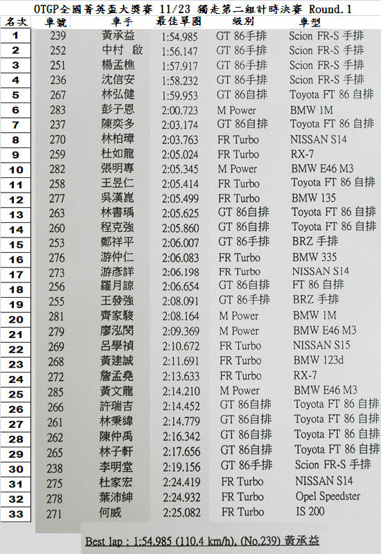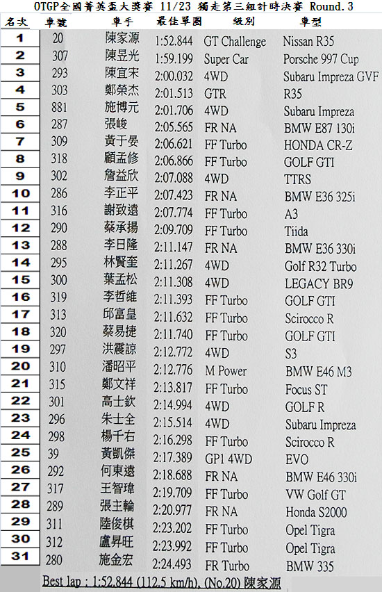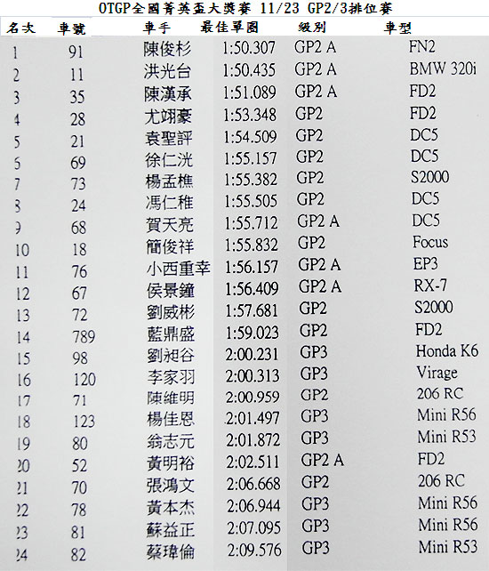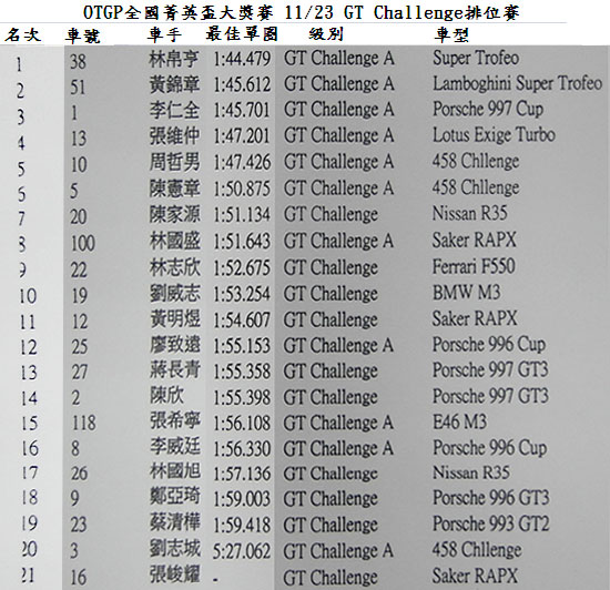 全國賽道菁英爭霸主戰場的2013 O.T.G.P.全國菁英大獎賽年終封王戰,共吸引229輛次各級距參賽車參戰。11/23當天由位車參賽車進行獨走計時賽第一回合及爭先測時排位賽。精彩壓軸的各級爭先決賽預定周日(11/24)進行,並有閒逛Pit Lane、甩尾表演、超跑展示及幸運觀眾試乘拉近觀賽車迷與賽車、車手、車女郎近距離接觸。歡迎賽車迷親臨屏東大鵬灣O.T.G.P.年終冠軍戰現場為選手們加油,感受台灣最熱血的賽車盛事。