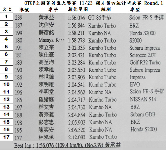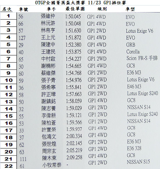 O.T.G.P.全國菁英大獎賽年終封王戰11/23首日成績