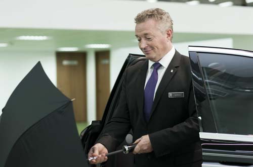 | 護送女性乘客下車時,你必須站立在對開式車門中央,並最好以車門內的專用傘避免女士春光外洩,這招是奧斯卡典禮入場時最常見的應對方式。 |