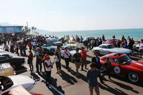 | 骨董車隊在枋山休息區稍事休息,骨董車搭配碧海藍天的景色,吸引大批民眾駐足欣賞。 |