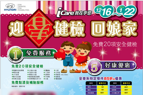 HYUNDAI對於您及您的愛車的關愛時候又到了,三陽HYUNDAI汽車為感謝多年來車主的愛護與支持,於102年12月16日~103年1月22日展開跨年度的「迎春健檢回娘家活動」。三陽HYUNDAI汽車將以全國優良服務廠,以及八百餘位經驗豐富的技師所組成的優秀團隊,以誠摯的心,替愛車準備了「i Care我在乎您五大關懷活動」,實施一連串的安全檢查及好康超值服務。