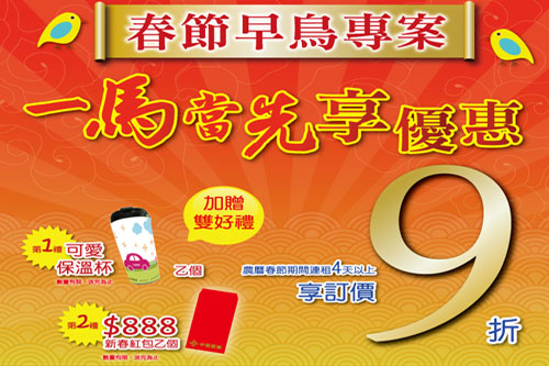 中租租車感謝回饋,農曆春節期間(即103年1月29日至2月4日)預約租車連續四天以上,立即享有折扣優惠,以及天天888元紅包,每車再送暖冬保溫杯。即日起至12月31日前,預約連租四天以上享定價9 折優惠,1月1-15日預約連租四天以上享優惠9.5折,新春紅包折價券可每天現抵租車費用新台幣888元,更多資訊請連結至中租租車網站(www.rentalcar.com.tw) 或洽服務專線0800-588-508。