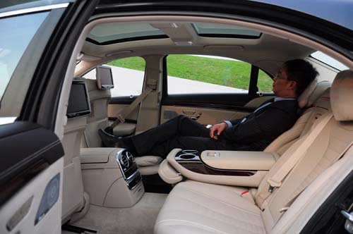 這次在中國試駕S-Class,跟平常的新車試駕活動安排有一些不太一樣的地方,大多數的試車都會安排較長的時間以利深入試駕車輛,不過M.Benz顯然很清楚S-Class最大的賣點是後座,對於後座買家來說,車輛開起來的手感如何、反應如何倒是其次,最重要的後座的大位坐起來舒服與否,才是真正最受關注的重點。M.Benz準備了一段長達200公里的路程讓我們一行人體驗車輛的後座舒適性,在這段不算短的旅程裡,我們也顧不得節能環保,只想找一部有著全套豪華套件的試乘車,作為這段旅途的伴侶,一趟在地面上的飛行旅程就此展開。對我們來說,試車就應該親自握著方向盤駕車上路,不管面對的是什麼樣的路況,坐在後座「試乘」多少有點不習慣,再加上完全不認識的司機替我們開車,剛上車的時候難免尷尬,不過S-Class後座的豪華配備與雙邊獨立的影音娛樂系統,很快就讓我們忘了剛上車的尷尬氣氛。對於經常得待在車上的大老闆來說,加上全套選用配備的後座所展現出的乘坐舒適性絕對是十足迷人的特色,在上路後不久,我們就把後座調整為接近仰躺的最舒適角度,後傾的椅背加上向前延伸的腿靠,再配上蓬鬆的頭枕,整個乘坐姿勢就像是大型客機的商務艙,再配上左右獨立的兩套影音娛樂系統,以及M.Benz事先在車上準備的飲料零食,確實把S-Class的後座氣氛變得像是大型客機的商務艙一般,或許S-Class的後座不像新式商務艙可以完全平躺,不過有一點絕對贏過機艙,那就是優異的車艙隔音,即使再怎麼怕吵,在S-Class的車艙裡也不用全程戴著抗噪耳機。