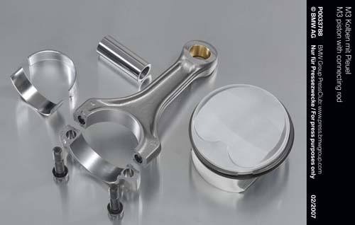 | 此為E92 M3原廠引擎內部的活塞與連桿圖,可以發現原廠活塞頂部呈現微凸設計,可獲得高壓縮比的效果,而連桿則為I斷面的鑄造連桿,粗度則比一般市售車來得粗一些。 |