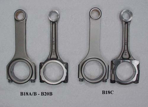 | 這張圖的左邊為Honda B20B引擎的原廠連桿與鍛造連桿,右邊則為B18C黑頭的比較圖,可以發現原廠連桿相較於鍛造連桿真的比較細,也因此鍛造連桿才能承受較高的增壓值與轉速。 |