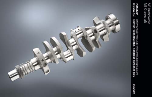 | 此為E92 M3的原廠曲軸,可以發現曲軸柄的長度並不長,且整支曲軸上有著許多動態平衡後的鑽孔,目地都是為了追求高轉速時所需的設計。 |