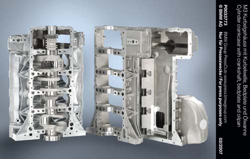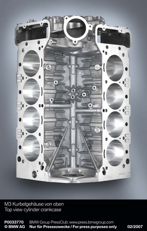 | 此同樣為E92 M3原廠曲軸箱的設計,可以發現這顆引擎的下半座採用兩層式設計,用來固定曲軸的軸承座乃是採用整體性設計,可提昇曲軸頸的固定強化,能在高轉速時提供穩定不晃動的固定效果。 |