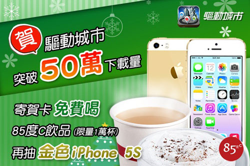 因應歡樂聖誕節將至,『驅動城市』App為回饋廣大使用者,應景推出「聖誕卡好禮」活動,祭出金色iPhone 5S 、新光三越禮券、85度C免費飲品等好禮,活動期間自2013年12月10日至2014年1月5日,只要進入『驅動城市』App即可參與活動,完成任務立即得好禮。