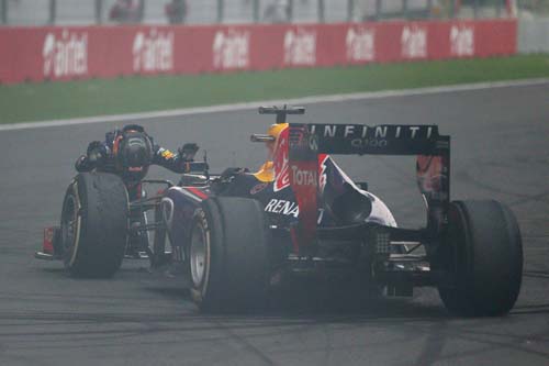 印度站儘管Mark Webber因機械故障而未得分,但Vettel再獲一勝的積分已足夠讓Red Bull提前封王,因此該站同時確定2013年的車手車隊雙料冠軍──當然也是四連冠。Red Bull的車隊冠軍當然不能說沒有Webber的功勞(儘管不大──本期截稿前他自己的車手積分才第5),但在自己未得分的時候、車隊封王了,會有最強烈的感覺自己對於車隊霸業可有可無,雖然反正車隊本來就不在乎他。然而,Webber在車隊提前封王之後卻彷彿穩了起來──截稿前的阿布達比和美國站,竟然才是他今年頭一次連續站上頒獎台!或許很難想像他和那位已經八連勝的Vettel開的是同一隊的車子──請注意:我沒說是同一款車子──Webber向來賽車故障率偏高,Red Bull要壞車、幾乎都是壞他的車,甚至有賭盤已經不再賭他跑第幾名、而是會壞哪裡!但是,Red Bull就算要搞他,也不至於把他的車子搞得比Mercedes和Ferrari還差(什麼?有可能?那車隊真不是人)吧?長久以來,Webber的起跑一直是個罩門,每站起跑平均掉兩個位置早已算常態,我以前就說過,掉愈多位置、致使前面車愈多,就表示愈容易被捲入事故(被包圍而無處閃躲),之前的Vettel也有這個弱點,但如今已經大有改善。我們今年看過Webber從十幾名開外起跑、最後還上頒獎台,表示他的超車能力還不錯(但也是車隊改變輪胎策略,讓他可以少休停一次),但起跑狀況始終不理想,就算扣除那些一起跑就壞KERS、壞Launch Control、壞……(真的很多)的次數,都還是不少,假如Red Bull真的有搞他,再加上自己的問題,也難怪他在冠軍車隊卻連爭季軍都成問題。
