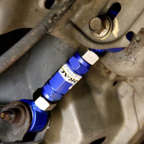 懸吊系統除了避震器外,主要是由支架、連桿、防傾桿、輪胎、煞車等套件所組合而成,其中最基本的就是形式不一的支架、連桿,而強化連桿則是針對懸吊結構進行強化,這些是有關節、可活動的結構,因此換裝強化部品後,可以很明顯感覺車身動態與操控性能的改變。可調式強化連桿大多是用於替換多連桿式懸吊系統,或是可以調整定位角度的底盤套件,例如市面上常見的仰角、束角調整器等,這些套件不但擁有比原廠件更高的強度,還具備更大的定位角度調整空間,此外,這類可調連桿接頭大多都是採用強化硬橡皮甚至是魚眼套件,不僅耐用度增加許多,更可讓車輛操控感更為精進。