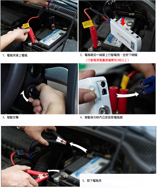 CPB多功能汽車應急啟動電源用在排氣量3000CC以下的汽油引擎汽車時,必須搭配專用的電源輸出線,操作步驟與一般接電救車流程相當,如下圖。目前市售價格約3~4000元,對於可能前偏鄉且0800救援鞭長莫及的駕駛人而言,的確有相當高的便利性。