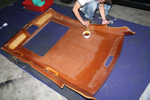 | 頂篷布面重新黏合時需將原本的環保黏膠完全去除,再塗上新底膠後,才能再噴上不同成分的黏膠將布面黏上,這樣一來的布面才能有長效壽命。 |