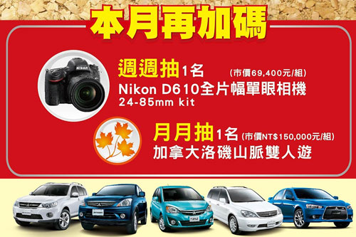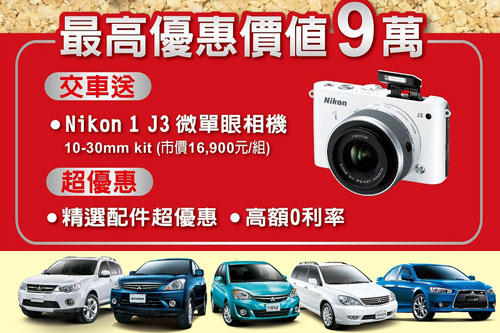結合兩年一度的台北新車大展擴大買氣,MITSUBISHI續推出最強促銷方案,凡於月底前購買OUTLANDER、OUTLANDER iO、COLT PLUS、LANCER FORTIS、LANCER iO、SAVRIN、ZINGER、LANCER SPORTBACK及PAJERO任一車款,並完成領牌手續,立即贈送 【Nikon 1 J3 微單眼相機】 (廠商建議售價約16,900元/組)。此外,週週抽【Nikon D610 高階單眼相機】(市價69,400元/組) 、月月加碼再抽【加拿大落磯山脈雙人行】(市價150,000元/組),越早買車機會越大。還有好評不斷的「三菱攝影學堂」活動同步放送中,即日起至1月19日至全省中華三菱展示中心報名,就能參加Nikon School攝影課程,讓你簡單使用類單眼相機就拍出令人感動的好照片。