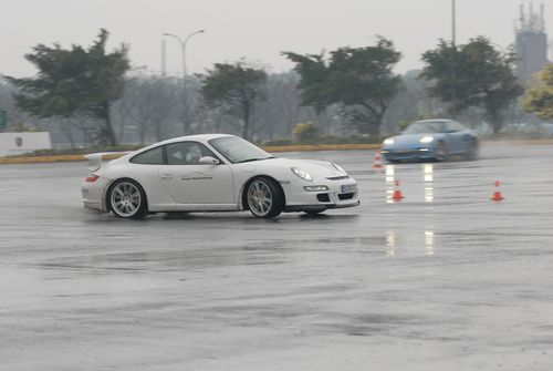 所謂的正確行車路線包括煞車點的判斷、外內外基本過彎路線及慢進快出等重點,且由於場地溼滑,各種不同驅動方式的特性也變得更加明顯。如MR配置的Cayman S雖可維持十分中性的轉向反應,但在彎中補油時仍會感受到後輪不斷向外滑出,而Carrera S不僅為RR配置,動力輸出也是三部車中最大,只要入彎速度略快,車尾便會毫不留情地開始扭動。