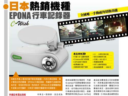 另一個重要功能特點是,假若車內突然熄火斷電,Epona還可持續錄製5秒,因為鋰電池耐熱度較差,僅約攝氏60°,加上台灣夏天高溫難耐,車內易超過攝氏60°,對於鋰電池產品會有爆裂的可能!創研光電更強調,提供高安全性的產品給消費者是公司的首要責任。其影像品質的穩定性及強化夜視功能效果,屢獲日本消費者的肯定。這些成果代表的是長期與日本大廠合作得來的經驗值,C-Wish產品絕對是台灣消費者的優質選擇!EPONA在日本搶先上市立即成為行車記錄器的熱銷款,售價為¥26,250(約為NT$9,400)。不須親自奔波到日本,即能以最超值近1/2的價格,輕鬆擁有與愛車內裝風格完美整合的EPONA行車記錄器。