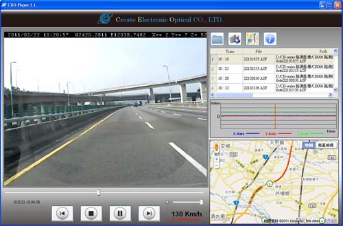 | 其專屬的行車記錄影像撥放軟體,清楚顯示每一項重要資訊,清晰的行車過程影像、G值反應數值及行車動向位置,都能為您完整呈現! |