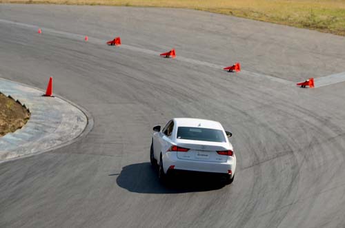 由於習慣了LFA Nurburgring Package與IS F CCS-R的駕控感,換了IS350 F Sport後的入彎速度都太快,面對大角度連續S彎時很容易逼出轉向不足的情況,還好高剛性車體及配重均衡在這方面幫了不少忙,只要適時轉動方向盤並運用重心轉移特性,後輪驅動會讓你找到最恰當的出彎加速時機且呈現穩定控感,再次突顯FR前置引擎後輪驅動的高運動特質。此次IS350 F Sport的主要訴求與重點除了F Sport運動套件,另一項創新科技就是最新的LDH動態操控輔助裝置,透過後輪主動轉向與前輪轉向齒比的調整控制與電腦整合,讓IS350 F Sport即便在賽道上須面對輪胎抓地力有限的工作環境,但仍能透過電子控制系統的介入而修正轉向不足或轉向過度的情況,大幅提高IS350 F Sport的主動安全標準。