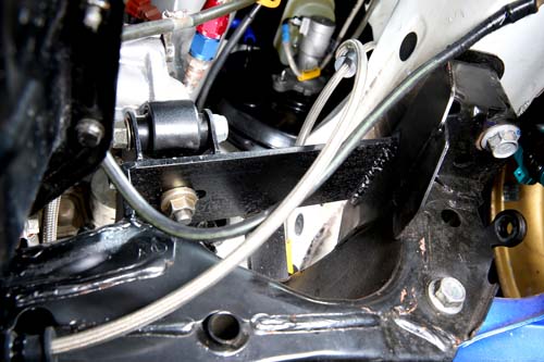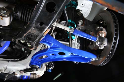 | 後驅車的動力傳輸是藉由後差速器傳達出,因此後樑則是會受到相當大的施力,圖中即可明顯看到塗有Hardrace企業色的後樑,在Hardrace的強化下已經將大樑墊片、鐵套、差速器鐵套及結構桿全數更換。 |