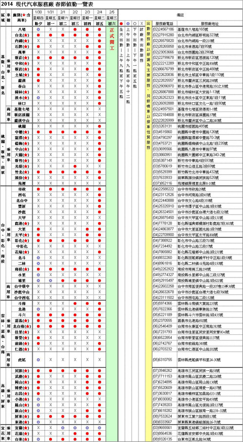 HYUNDAI於今年新春期間(103年1月30日至103年2月4日)上午09:00~下午17:00,在全省主要據點,將會提供您全面的服務;消費大眾如需要服務,可以直接撥打服務專線:0800-00-33-55,將有專人為消費大眾服務,不論你身在何方,HYUNDAI都會明確引導消費者到最便利的服務中心接受服務;或者消費大眾也可以上南陽現代官方網站(www.hyundai-motor.com.tw)先行查詢你所需要的服務據點。HYUNDAI會將全省的服務據點與服務時間公告給消費大眾查詢。HYUNDAI將會為您在有急需的情況下,提供第一時間的協助,並於2月5日全面恢復正常營業。而展示營業服務將從2/3日(一)大年初四開始為消費大眾提供賞車購車服務。