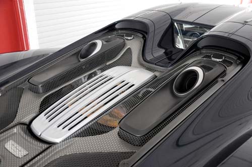 相對於車頭的造型設計,車身後半段的設計才是918 Spyder的精彩之處,引擎蓋的上半被朝上的排氣系統所佔據,鏤空的外蓋讓人可以稍微窺伺引擎蓋下的機件,不過引擎蓋並不能開啟,車主能打開的部分僅有添加機油的位置而已。朝上的排氣管看來十分特立獨行,但其實是工程師精心安排的結果,由於918 Spyder車上得要搭載電池,概念車時代設計的側排會讓熱量堆積在電池周邊,因此把排氣管修改為朝上,不僅縮短了排氣路徑,更避免了熱能堆積。