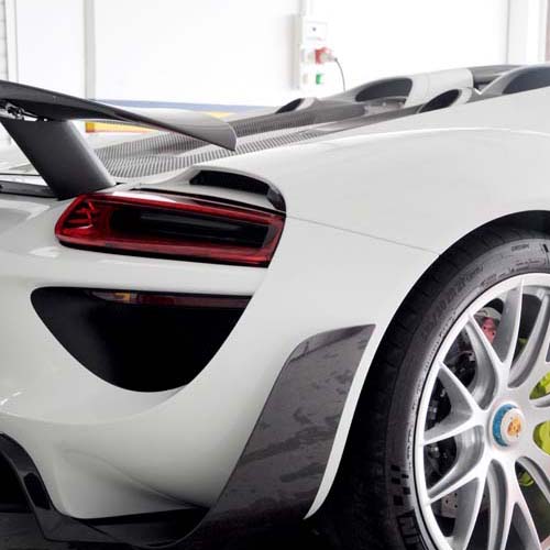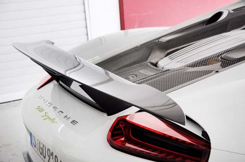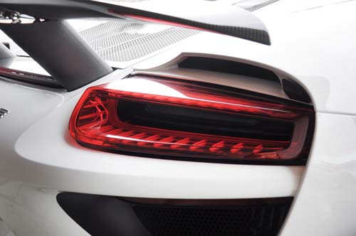 Porsche原廠提供給918 Spyder買家的唯一選用套件就是Weissach Package,這套套件包括了大量的碳纖維輕量化部件、鎂合金輪圈、Alcantara內裝飾板、防火賽車椅與六點式安全帶等配件,照片中的碳纖維風刀當然也是其中項目之一,選配這套套件雖然要價不菲,但車輛的性能也能得到相應的提昇。