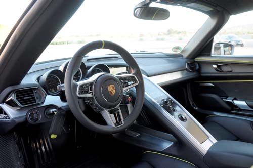 918 Spyder的車艙內部設計風格偏向科技風味,中央鞍座採用了鏤空的上昇式設計,空調與音響操作介面除了兩個大型旋鈕之外,其他的控制都得透過中央鞍座上方的觸控面板進行。比較有趣的部份是918 Spyder採用PDK雙離合器自手排變速箱,手動換檔只能透過換檔撥片進行,因此排檔桿的體積縮至極小,電子手煞車也只需要一個小小的按鍵,因此車艙內部的陳設看來十分簡單。918 Spyder的方向盤則是車艙內重要的亮點,方向盤的骨架以輕合金製作,大型換檔撥片則是超級跑車必須的裝備品。當然最受關注的部分是右下的動態模式切換旋鈕,旋轉旋鈕可以切換E-Power、Hybrid、Sport-Hybrid與Race-Hybrid四種模式,按下旋鈕中央的紅色按鈕,則可以啟動性能最為狂暴的Hot-Lap模式。