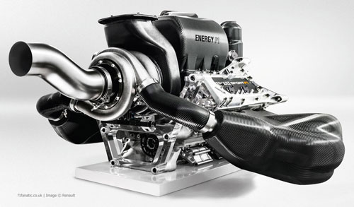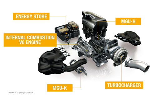 更大的重點則是在引擎,必須搭載1.6升V6引擎,每缸排氣量需相同,且缸徑衝程必須為80mm×53mm,轉速也下修限制至15000rpm。然而為了讓散熱效果更優異,中冷器面積也將加大,車側散熱口也因此加大面積。而ERS動能回收系統,在原有MGU-K(Motor Generator Unit – Kinetic,連結傳動系統)外,2014年以MGU-H(Motor Generator Unit – Heat,連結控制排氣渦輪增壓系統)令車輛依進氣需求量來調整渦輪增壓葉片轉動速度,以改善渦輪遲滯現像。
