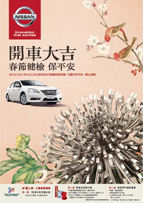 緊接著2014跨年活動之後的,便是讓許多人期待的農曆春節假期,不少讀者會在此時返鄉與家人團聚,或是安排出遊行程。除了出遊須預先訂房之外,行前資訊準備也相當重要,因為春節期間熱門景點都會出現大量車潮與人潮,高速公路於部分時段也會進行管制,出發前更需要做好車輛五油三水與輪胎的檢查工作,畢竟半路拋錨故障絕非你我樂見;車廠在春節前大多會推出健檢活動,若能預先進廠維修保養則最為妥當。事先做好準備動作,才能擁有順利開心的旅途。
